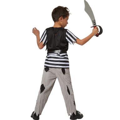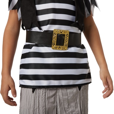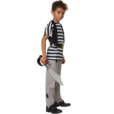 Drengekostumet, sød pirat, består af et par bukser i to lag med elastiklinning. Det inderste lag er et par lange satinbukser, mens satinlaget ovenpå er i krøllet look, har huller og løber ud i et frynsemønster. Overdelen er en tværstribet kortærmet shirt med frynsemønster for enden af ærmerne. På den er der syet en kort, ærmeløs vest, der foran i enderne også løber ud i et frynsemønster. I nakken er der en lukning. Forklædningen fuldendes af et bælte med et guldspænde, materiale: 100 % polyester.