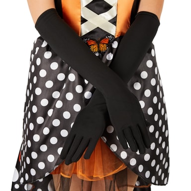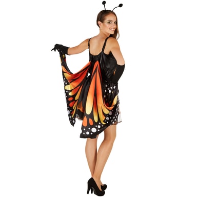 Kostume bestående af en kjole med korsage look, store vinger, lange handsker og en hårbøjle med følehorn. Materiale: 100 % polyester.