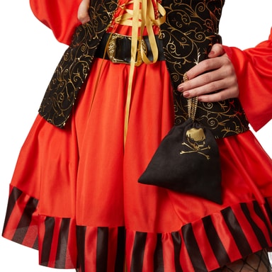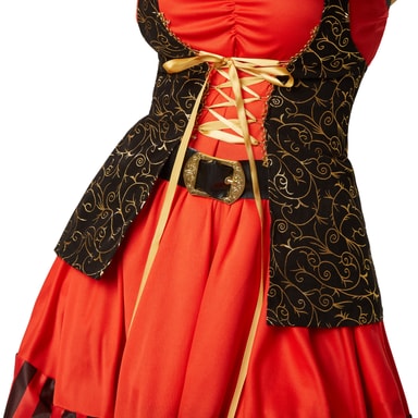 Damekostumet, sørøverbrud, består af en kjole, korsage til at snøre, manchetter til armene, et bælte, en hat med fjer og en minitaske. Materiale: 100 % polyester.Som den sexede sørøverinde vil du være den sejrende i enhver kamp til søs.Læs mere om produktet