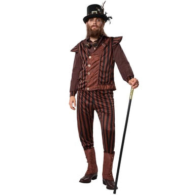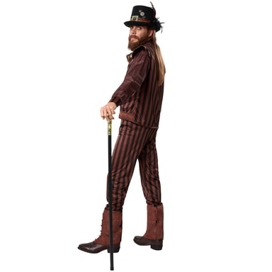 Herrekostumet, Steampunk Gentleman, består af lange, stribede bukser af satin og støvleskafter i ruskindslook. Den langærmede skjorte har knapper og en krave. Manchetterne matcher buksernes stribede look. Den ærmeløse vest med skulderstykker er også holdt i et stribet mønster. Den kan knappes og har en indsats i ruskind med spænde, materiale: 100 % polyester.
