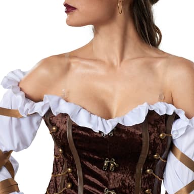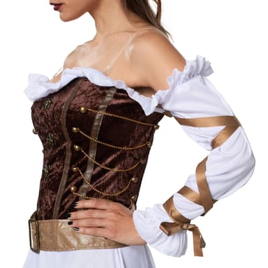 Kvindekostumet, Steampunk Slotsvagt, består af en skulderløs silkekjole med en nederdel, skåret kort foran og lang bagpå. På forsiden består nederdelen af to korte lag satin. På siderne løber den sammen til en lang nederdel i ét lag. Overdelen er af fløjl med læderstriber, påsyede metalhægter i midten og fem guldkæder på hver side. I dekolleté-området sidder fint satin. To bånd af kunstlæder er påsyet på skuldrene, og disse forbinder sig langs ærmerne til et attraktivt mønster. En elastiklinning i kjolens øverste del gør den nemmere at tage på. Tilbehøret består af et bredt bælte i læderlook og gennemsigtige, aftagelige skulderstropper. Steampunk slotsvagtens optræden er pikant og attraktiv. Overdelens form med guldkæderne på siden, armbåndene og det brede bælte giver outfittet militær-karakter. Det smukke dekolleté og kjolens skulderfri område sammen med den korte nederdel betoner på den anden side kostumets feminine side.