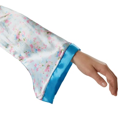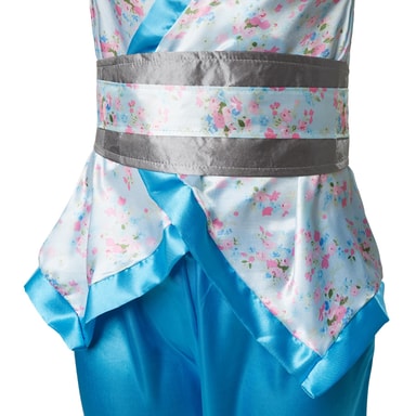 Pigekostume, asiatisk inspireret, består af en overdel, et par bukser samt et bælte af satin. Den traditionelt omviklede overdel har et diskret blomstermønster og en lyseblå søm.Læs mere om produktet