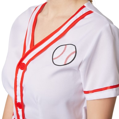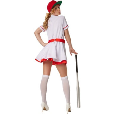 Damekostumet, Baseball spiller, består af en hvid kjole med en rød krage og V-udskæring samt en række knapper ned ad maven. Baseball kostumet har pynt med 2 røde knapper og et påsyet baseball mærke. Der hører også et fint stofbælte med, med guldfarvet plastspænde. To underskørter, det ene med et rødt bånd i kanten, og hvide sokker, der passer til, gør dette eksklusive karnevalskostume fuldendt. Materiale: 100% polyester.