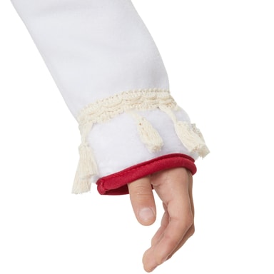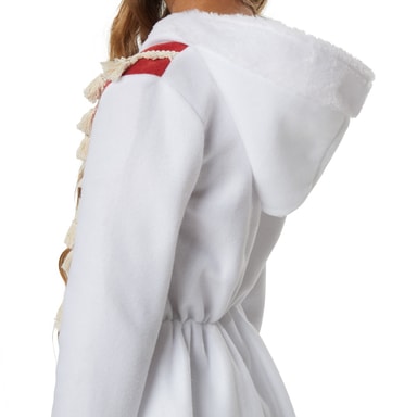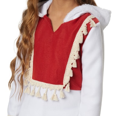 Pigekostumet, Eskimopige, består af en kjole med indarbejdet hætte og benvarmere. Kjolen er af hvidt fløjl, og på ærmerne og nederdelens søm er den forsynet med hvid plys og et rødt bånd. På den øverste del er der en rød fløjlsindsats. Denne er omkranset af en off-white pyntebort med kvaster i hæklet look. Samme omkransning genfindes på ærmerne og benvarmerne. Hætten er af hvidt fløjl med en hvid plyssøm. På vrangsiden af taljen sidder der et elastikbånd, så kostumet sidder bedre. Benvarmerne er lavet af rødt fløjl sømmet med plys, materiale: 100% polyester.