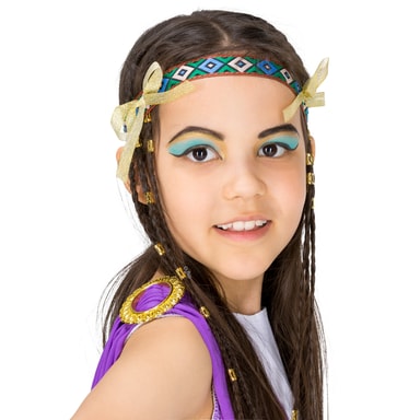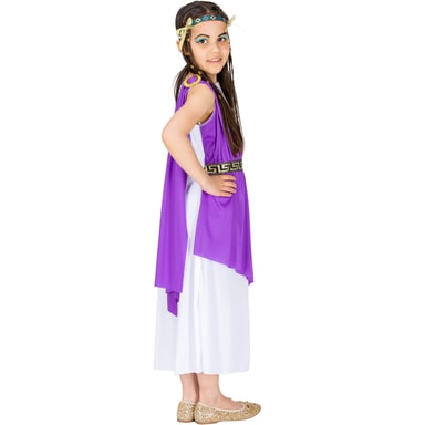 Kostume til børn Den græske gudinde Athene består af en smuk lang kjole i lærredslook med et påsyet lilla tørklæde og en skøn bort i brokadestil. På kjolen sidder der et vidunderligt gyldent spænde i antik-look. Der hører også et elastisk, pyntet hårband til, materiale: 100 % polyester.