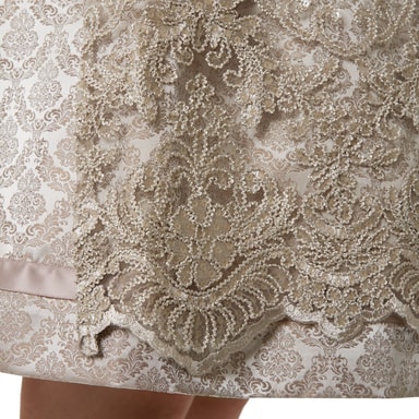 Dirndlens nederdel er prydet med florale ornamenter og får en legende og samtidig luksuriøs note gennem det sarte rosafarvede blondeskørt. Særligt raffineret: De blødt faldende folder på bagsiden sørger for en flydende bevægelse, når du går, og en elegant silhuet.
