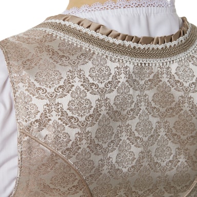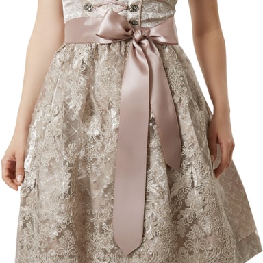 Den sarte farvekontrast mellem rosa og beige virker ædel, feminin og alligevel moderne – en kombination, der nyfortolker klassiske folkedragtelementer. Dirndlen kan fremragende kombineres med lyse bluser, sarte smykker og pumps eller ballerinaer i rosé eller creme.