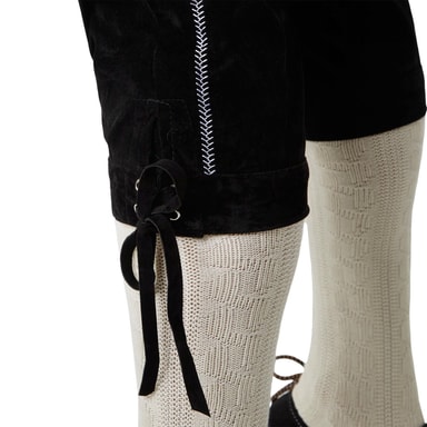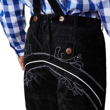 Lederhose Hannover i knælængde er holdt i markant sort. De mange indstillingsmuligheder man får med de små læderbånd og de aftagelige seler gør, at bukserne er rare at have på.Læs mere om produktet