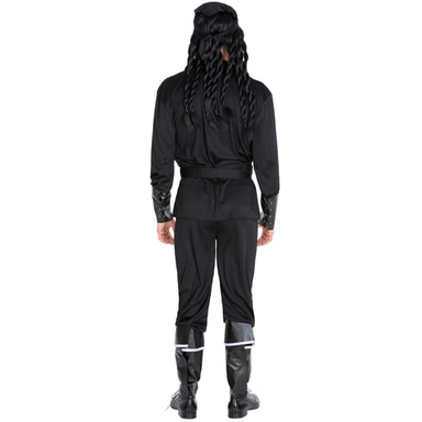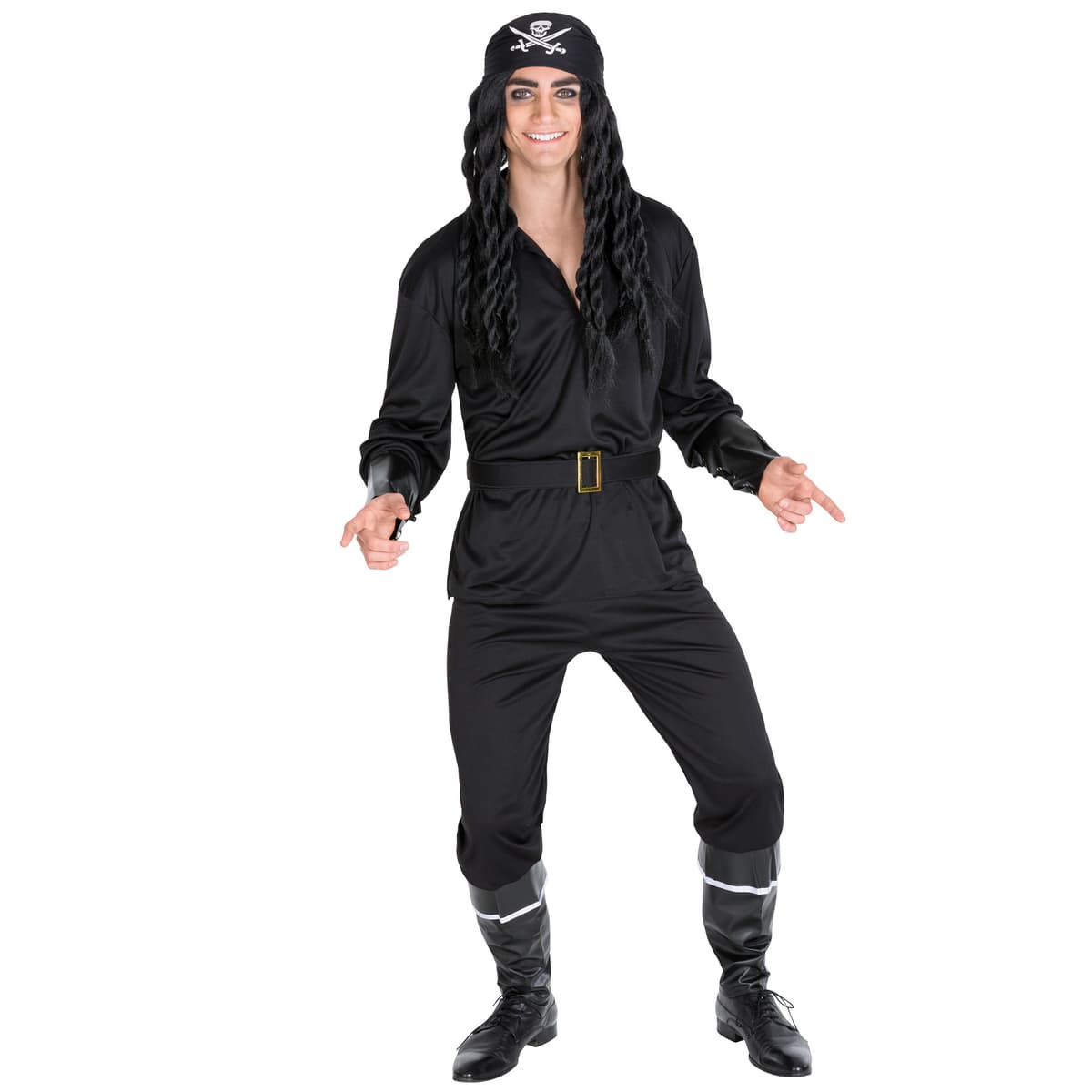 Kostume til mænd, Piraten Stubbeskæg, består af et par jersey stretch bukser med elastiklinning samt en overdel i jersey stretch med skjortekrage og V-udskæring. Der følger også et trekantet hovedtørklæde, 2 støvleskafter af imiteret skind med selvklæbende båndlukning, 2 løse ærmer i imiteret skind til at binde og et flot bælte med gyldent spænde med. Materiale: 100 % polyester.