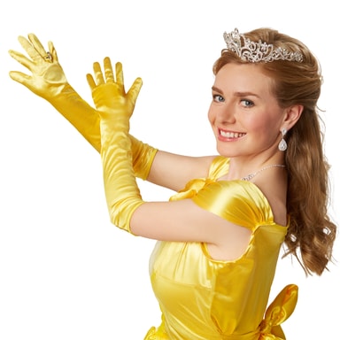 Dette flotte kostume, Belle, består af en High-Low balkjole med silkelook med tyl og blonder. Kjolen har sin flotte form på grund af et underskørt i tyl. To skåle med flæser på understreger udskæringen på den stramme overdel i stretch. De lange satinhandsker fuldender denne drømmekjole i gult. Lynlås bagtil. Materiale: 100% polyester.