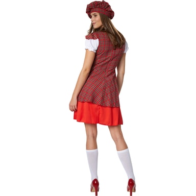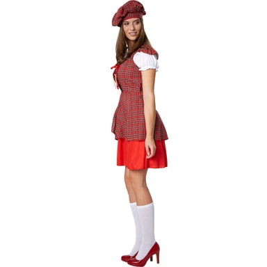 Kvindekostumet skotsk kvinde er holdt i det landetypiske ternede mønster. Den passende ensfarvede bluse har påsyede flæser på ærmerne og i brystudskæringen. Overdelen har skulderkapper og en antydet corsage-snøring. Kraven og indsnøringen er holdt ensfarvet. Det ternede overskørt er slidset op foran, hvorved det længere, ensfarvede underskørt kommer til syne. Til at komplementere kostumet leveres kostumet med en ternet hue samt et par ensfarvede knæstrømper. Kostumet lukkes på ryggen med en lynslås, materiale: 100% polyester.