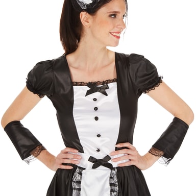 Det super flotte tjenestepigekostume består af en fortryllende, forførerisk kjole i sort og hvid. Kjolen er kort og har en fantastisk udskæring. Der medfølger desuden en fin hårsløjfe, flotte strømper og manchetter. Materiale: 100 % Polyester.