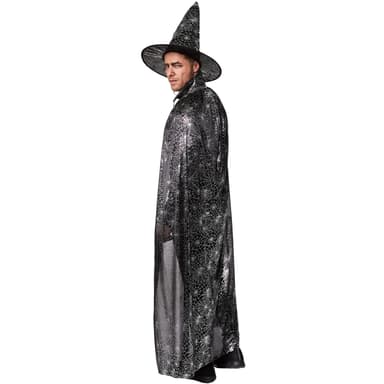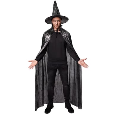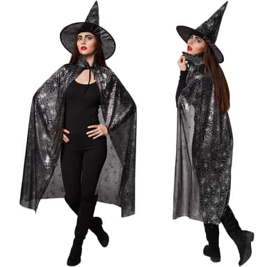 Sættet består af en skøn hat og en fantastisk kappe med et sølvfarvet, påtrykt edderkoppespind. Materiale: 100 % polyester.