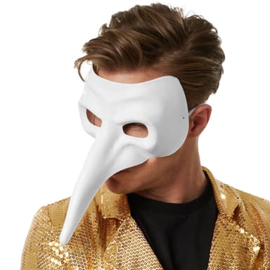 Denne venetianske maske med lang næse er i sandhed en imponerende fremtoning. Det karakteristiske kendetegn ved dette ensfarvede tilbehør er naturligvis den lange og let nedadbuede næse, der bogstaveligt talt springer i øjnene. Med de fine satin-bånd kan halvmasken, der er behagelig at have på, tilpasses til enhver hovedstørrelse, materiale: Kunststof, polyester.