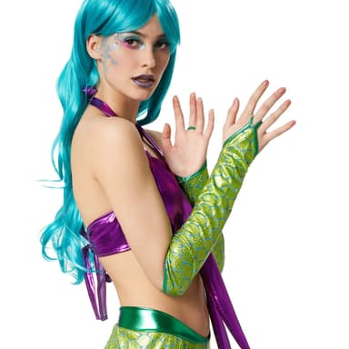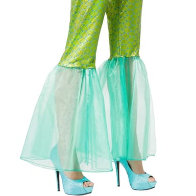 Kostumet imponerer med sin detaljeorienterede udformning og den harmoniske farvesammensætning i skinnende blå og grønne nuancer, der minder om havets farver. Med sine flydende stoffer og de transparente indsatser skabes en yndefuld silhuet, der ved hver bevægelse minder om havets bølger. De skæl-lignende detaljer giver outfittet et autentisk havfrue-look og glitrer i lyset som funklende vanddråber. Disse fantasifulde udsmykninger gør kostumet til et ægte højdepunkt og får dig til at fremstå som en ægte havprinsesse.