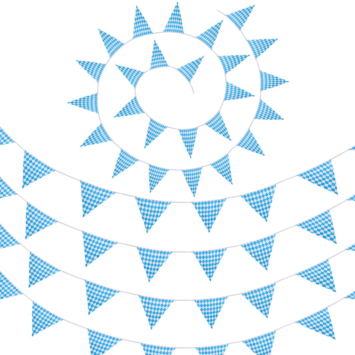 Vimpelkæden med blåt-hvidt rombemønster skaber virkelig Oktoberfest stemning til din fest. Den lette dekoration i Bayerns farver kan anbringes på ingen tid og er således straks klar til brug. De smukke, store vimpler er skåret glat og er syet på den øverste kant. Hele guirlanden er af vejrbestandigt stof og velegnet til en fest under åben himmel, materiale: 100 % polyester.