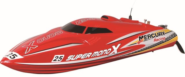Super mono x er en kraftfuld radiostyret båd med en topphastighed på 45 km / t. Udstyret med en vandkølet børsteløs motor giver det en hurtig oplevelse. Alt du behøver er et 9v sender batteri.Læs mere om produktet