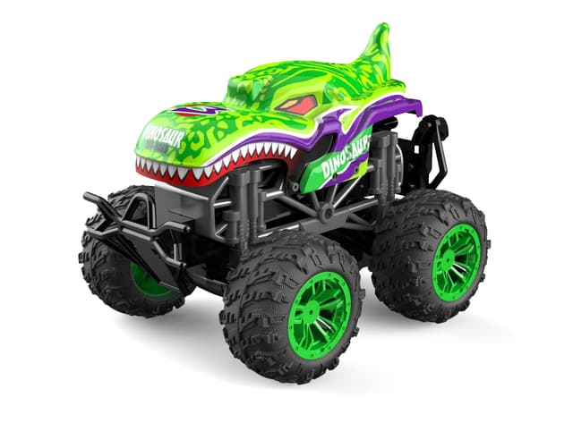 Dinosaur er en helt rå stuntbil som kan gjøre mange triks samtidig som den spiller musikk med blinkende lys og røyk som simulerer eksos bak. Bilen leveres komplett og klar ut av esken, lad batteriet med den medfølgende USB-laderen, sett inn 2 AA batterier (medfølger ikke), fyll på vann og du er klar til et forrykende show! Når du svinger med bilen, legger den seg til siden i stedet for å snu på hjulene og den kjører enkelt opp på bakhulene og kan snurre på en femøring.