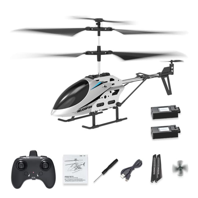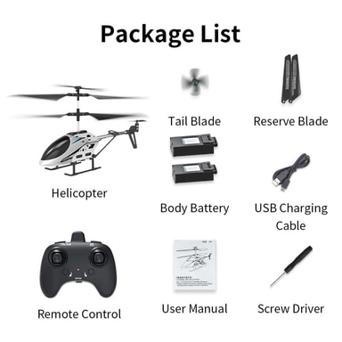 Pakken indeholder: 1 x haleblad 1 x sæt reserveblade 1 x fjernstyret fly 2 x flybatterier 1 x USB ladekabel 1 x engelsk brugervejledning 1 x skruetrækker 1 x fjernbetjening