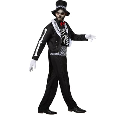 Herrekostumet, skræmmende gentleman, er sort og hvidt med røde highlights. Det består af et par lange bukser med elastik og en kortærmet T-shirt med lynlås på hele bagsiden, Kostumet passer perfekt til Halloween.Læs mere om produktet