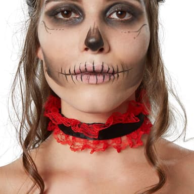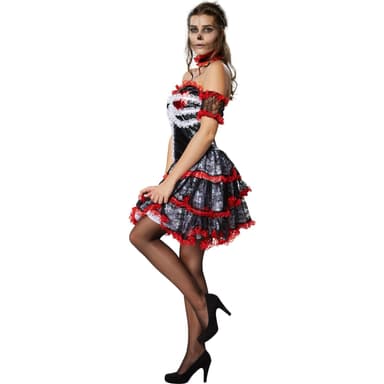 Kvindekostumet skræmmende elskerinde, er taljeret, ærme- og stropløst. Dekolletéet afsluttes med flæser. Flere blondeborter på forsiden følger skelet-printet. Kostumet passer perfekt til Halloween.Læs mere om produktet