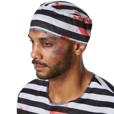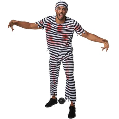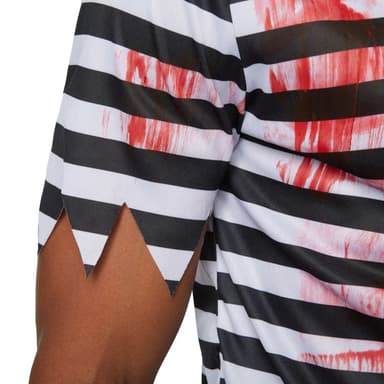 Herrekostumet, skræmmende fange, til Halloween består af en sort-hvid-stribet forklædning i tre dele med blodpletter. De lange bukser har elastik og zigzagmønster ved enderne. Den kortærmede overdel er også zigzagget for enderne.Læs mere om produktet