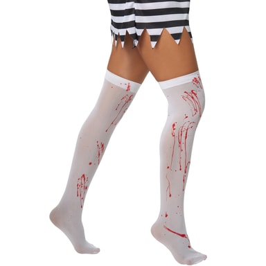 Kvindekostumet, Skræmmende fange-brud, passer perfekt til Halloween og har sort-hvide striber. Sømmen på skørtet og ærmerne trævler. Kostumet har masser af blodpletter. Tøjet falder ned langs figuren. Knæstrømper og hue fuldender outfittet. Materiale: 100% polyester.