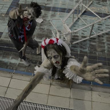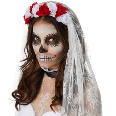 Kvindekostumet, skræmmende skelet-brud, er en kjole i to lag med stående krage og vatterede brystskåle. Snittet er taljeret. Nederdelen og ærmerne er syet med trompet-look. Det flotte kostume er perfekt til Halloween. Hele brystpartiet er af fin blonde med blomster, og det øverste af skørtet er af sort satin. På ryggen er der en ekstra lang lynlås, som begynder oppe ved kragen. Det sorte område i taljen har skelet- og hjertetryk. Ærmerne og knæstrømperne med skelettryk er ikke inkluderet. Der bør heller ikke mangle et slør med hårspænde med røde og hvide blomster. Materiale: 100 % polyester.