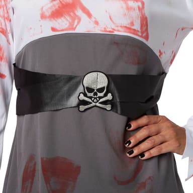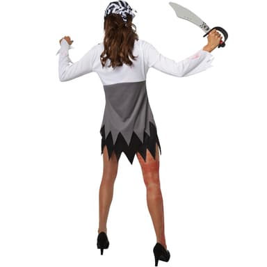 Kvindekostumet, skræmmende sørøverinde, som er holdt i tre farver, består af en kjole med frynset skørt i to lag og en hvid, langærmet overdel med trævler på ærmerne. Kostumet passer perfekt til Halloween. Den tofarvede krage har også trævler.Læs mere om produktet