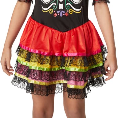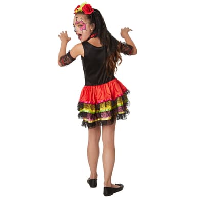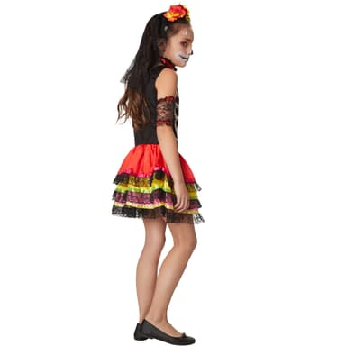 Pigekostumet, mexicansk Halloween, består af en ærmeløs kort kjole. Overdelen er trykt i mange detaljer med et stort skeletmønster og et hjerte på venstre side af brystet. Kostumet er perfekt til Halloween. Nederdelen er skåret i tre lag med en stribe af strålende satin og blonder for enden. Det inkluderede halsbånd lukkes. Den er lavet af sort, rynket stof og pyntet med et rødt satinbånd. Armvarmerne er af sorte blonder med røde elastiske borter. Et hårbånd med spraglede blomster og sort blondeslør gør denne skræmmende minikjole komplet, materiale: 100% polyester.