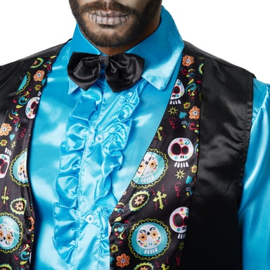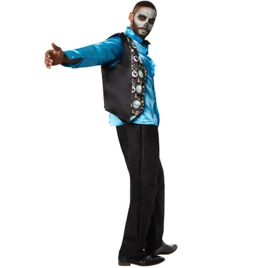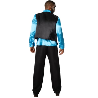 Herrekostumet, Disco king, består af et par lange bukser med elastik samt en silkeagtigt glimtende langærmet skjorte, som knappes, og krage og flæser for oven. Den ærmeløse vest kan også knappes og har farverigt spor og påsatte dødningehoveder, kors og andre symboler. Der følger også en butterfly med. Materiale: 100 % polyester.