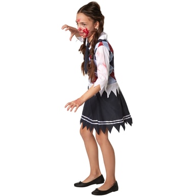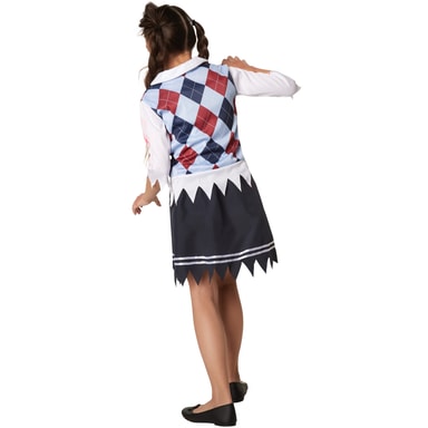 Det tredelte pigekostume, skræmmende skolepige, består af en overdel, en nederdel samt et slips, der fæstnes med et elastikbånd. Det skræmmende kostume er perfekt til Halloween. Overdelen er lavet i ét stykke. Blusen med påsyet slip-over I mønster har frynser på ærmerne og sømmen. Den typiske blusekrave samt hele overdelen er plettet af blod. Nederdelen med elastisk lukning har også frynser på sømmen og to påsyede rækker af prydbånd forneden, materiale: 100% polyester.