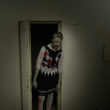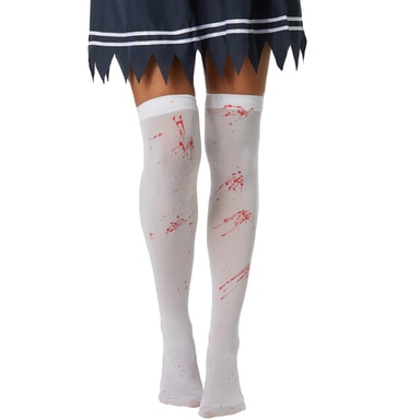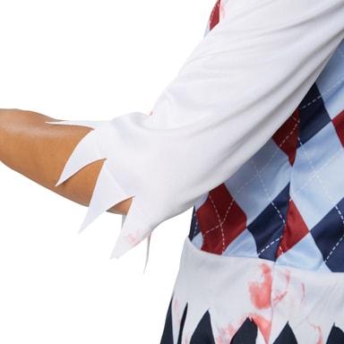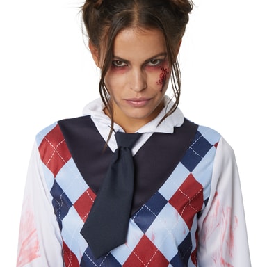 Damekostumet, skræmmende skolepige, består af en overdel i slipover-look med rombemønster. Dette kostume passer perfekt til Halloween. Skjorten er revet itu og fuld af blodpletter. Skørtet, som hører til, har en søm med striber og er også frynset. For et særligt look har kostumet et slips med elastik til at tage om halsen samt blodplettede knæstrømper. Materiale: 100% polyester.