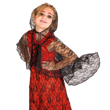 Halloweenkostume til piger - Vampyr med blonder af slidstærkt og behageligt polyesterstof. Kjole med satin look og med snøre og lynlås bagpå, fin kappe med hætte og en knap. Materiale: 100 % Polyester.