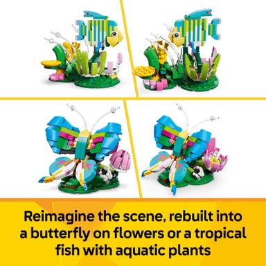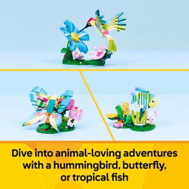 Børn kan bygge, lege med og udstille LEGO Creator 3-i-1-sættet Vilde dyr: Farverig kolibri og derefter ombygge til en sommerfugl eller en tropefisk.Læs mere om produktet