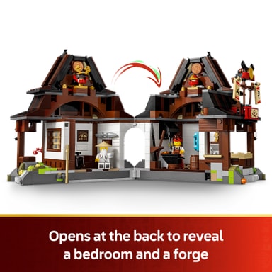 • SMEDJEMODEL – Når byggesættet er færdigt, kan modellen åbnes på forsiden for at afsløre et soveværelse og en smedje fyldt med detaljer fra serien til glæde for NINJAGO®-fans
