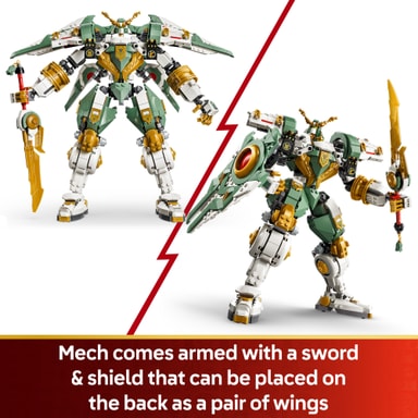 • SVÆRD OG SKJOLD SOM TILBEHØR – NINJAGO®-mech-legetøjet er bevæbnet med et sværd og – for første gang nogensinde – et stort klodsbygget skjold, der kan skilles ad og sættes på ryggen som et par vinger