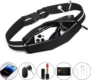 Goji GRUNB26 bæltetasken i elegant sort tilbyder et åndbart, tætsiddende design med justerbar rem til 25-55" talje, passer til telefoner op til 6,5", inkluderer jackstik til hovedtelefoner og nøglefag, perfekt til aktive livsstile.Læs mere om produktet