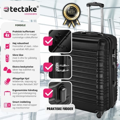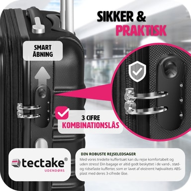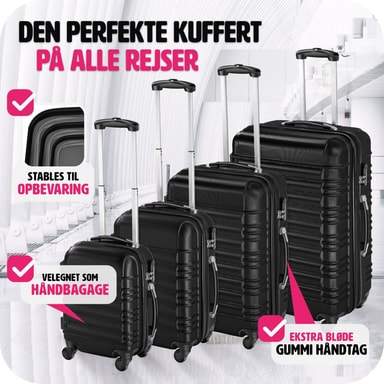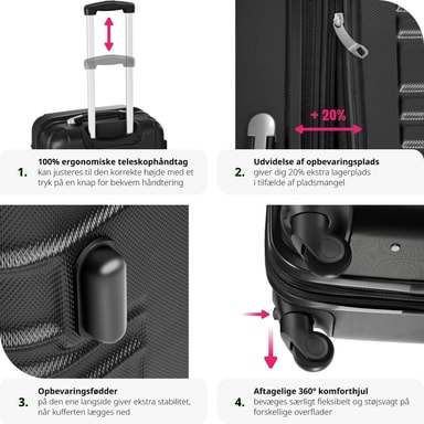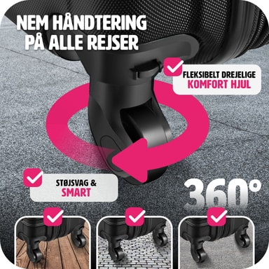 Dette bagagesæt er robust og har fire 360° drejelige hjul, en TSA-kombinationslås, et udtrækkeligt teleskophåndtag og trendy farver, og kan prale af blot et par af sine særlige funktioner. Indvendigt finder du endnu flere praktiske funktioner, såsom krydsremme og en rumdeler med en ekstra netlomme.