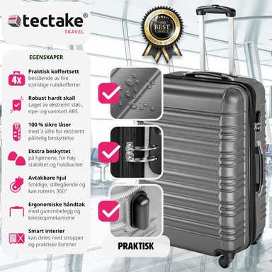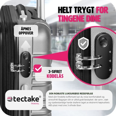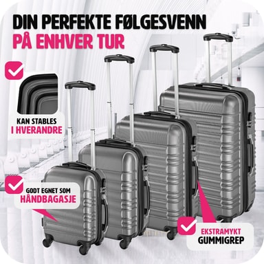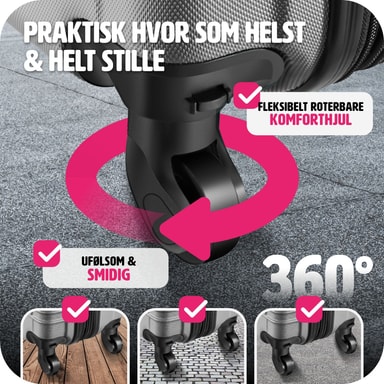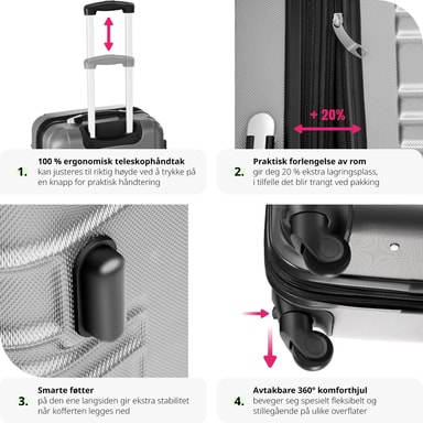 Dette bagagesæt er robust og har fire 360° drejelige hjul, en TSA-kombinationslås, et udtrækkeligt teleskophåndtag og trendy farver, og kan prale af blot et par af sine særlige funktioner. Indvendigt finder du endnu flere praktiske funktioner, såsom krydsremme og en rumdeler med en ekstra netlomme.