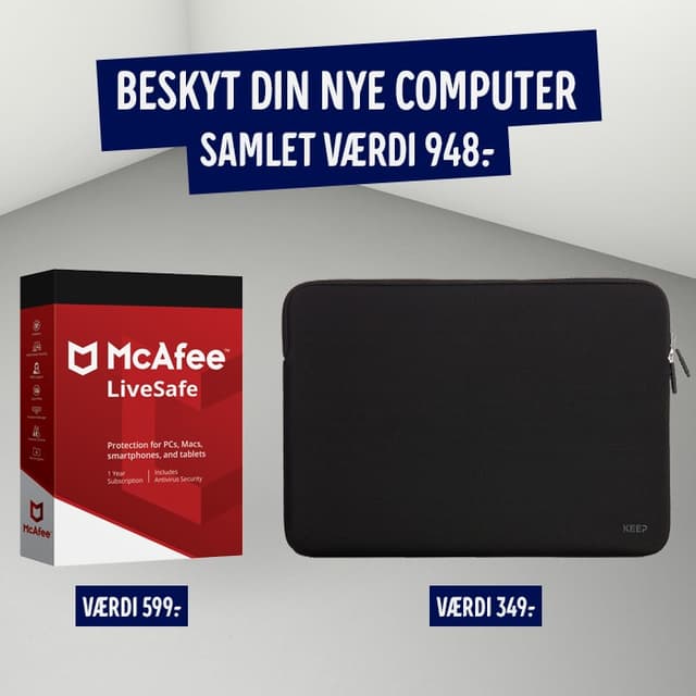 Beskyt din nye PC/MAC på bedst muligvis. McAfee beskytter dine personlige information på din computer, mens Keep sleeve beskytter din computers ydreLæs mere om produktet