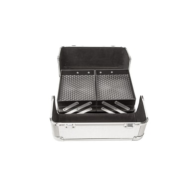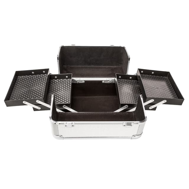 Denne makeupkuffert er udstyret med 4 store udklappelige rum, der giver en masse plads til en række forskellige ting. Ruminddelingen gør, at dine genstande altid er ordnet og adskilt fra hinanden. Denne makeupkuffert kan låses. De indvendige overflader er dækket med sort velour. Makeupkufferteb er ideel til en bred vifte af fritidsinteresser, f.eks.:, makeupkuffert, negledesignkuffert, frisørkuffert, skrædderkuffert.