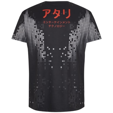 Sort T-shirt med Atari logo på fronten, japansk tekst på ryggen og med et 8-Bit design. Ideel til eSport. 100 procent polyester. Størrelse XS – hvilket svarer til en europæisk størrelse 46.