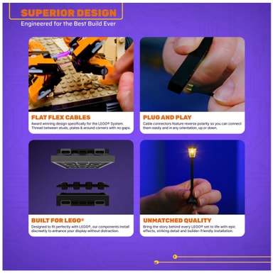 Sættet har båndtynde fladkabler, der passer perfekt mellem LEGO® knopper og plader, og kabelstikkenes vendbare design gør det nemt at tilslutte i alle retninger, hvilket forenkler installationsprocessen. Alle komponenter i lyssættet er fuldt kompatible med LEGO® knopsystemet. For detaljerede 3D-instruktioner, som kan følges under bygningen af modellen eller efter færdiggørelsen, besøg: Light My Bricks™ installationsguide
