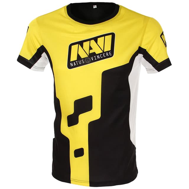 Gul, sort og hvid NaVi Player 2018 trøje med NaVi logoet på brystet, ærmerne og på ryggen. 100 procent polyester, størrelse XXL, svarer til europæisk størrelse 56.