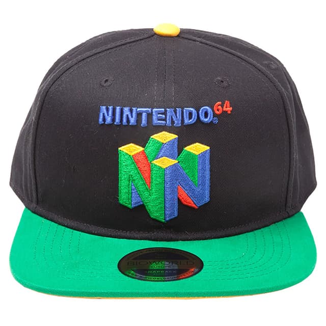 Sort og grøn snapback cap med broderi af Nintendo 64 design på fronten. 100 procent bomuld, one-size.Læs mere om produktet