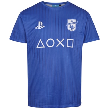 Blå T-shirt med PlayStation logo, PlayStation FC logo og controller ikoner på fronten. Ideel til eSport. 100 procent polyester. Størrelse XL – hvilket svarer til en europæisk størrelse 54.Læs mere om produktet