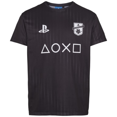 Sort T-shirt med PlayStation logo, PlayStation FC logo og controller ikoner på fronten. Ideel til eSport. 100 procent polyester. Størrelse L – hvilket svarer til en europæisk størrelse 52.Læs mere om produktet