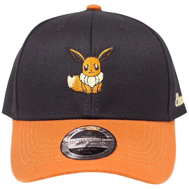 Sort og gul cap med billede af Eevee på fronten. Lavet i 100 procent bomuld. One-size.