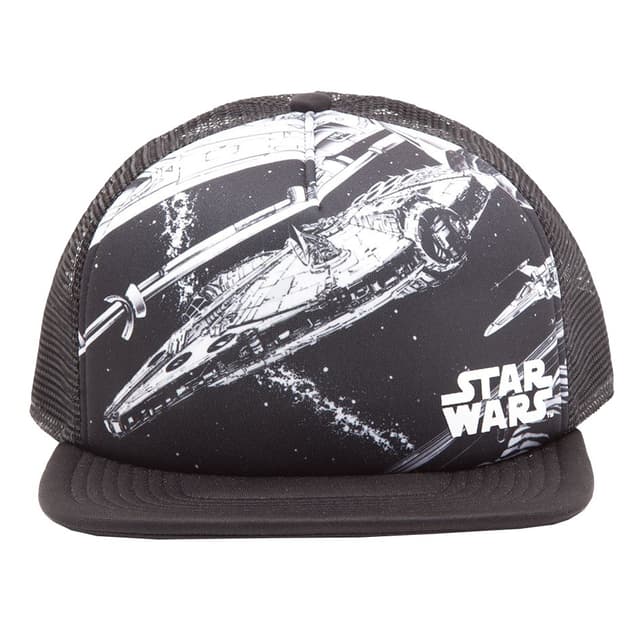 Sort og hvid snapback cap med Star Wars Millennium Falcon tema. 100 % polyester. One-size.